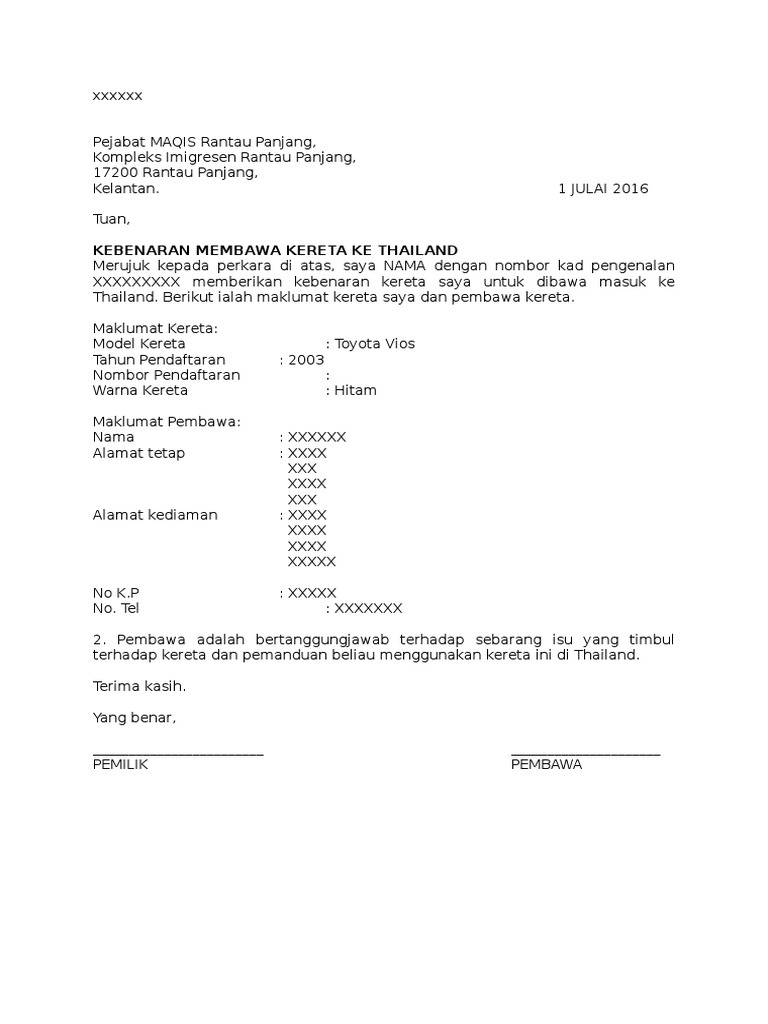 Contoh Surat Kebenaran Bawa Kenderaan Ke Thailand
