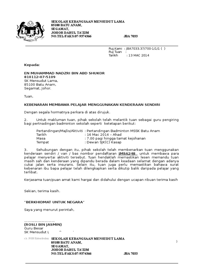 Surat Rasmi Permohonan Menggunakan Kenderaan Surat Rasmi K