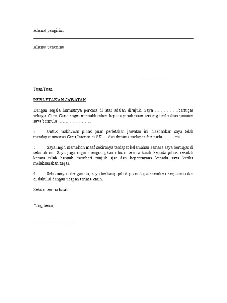 Contoh Surat Perletakan Jawatan Guru Ganti