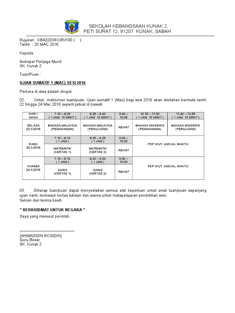 Contoh Surat Makluman Peperiksaan Kepada Ibu Bapa