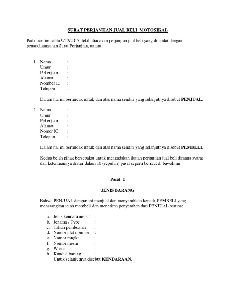 Contoh Surat Perjanjian Jual Beli Motorsikal