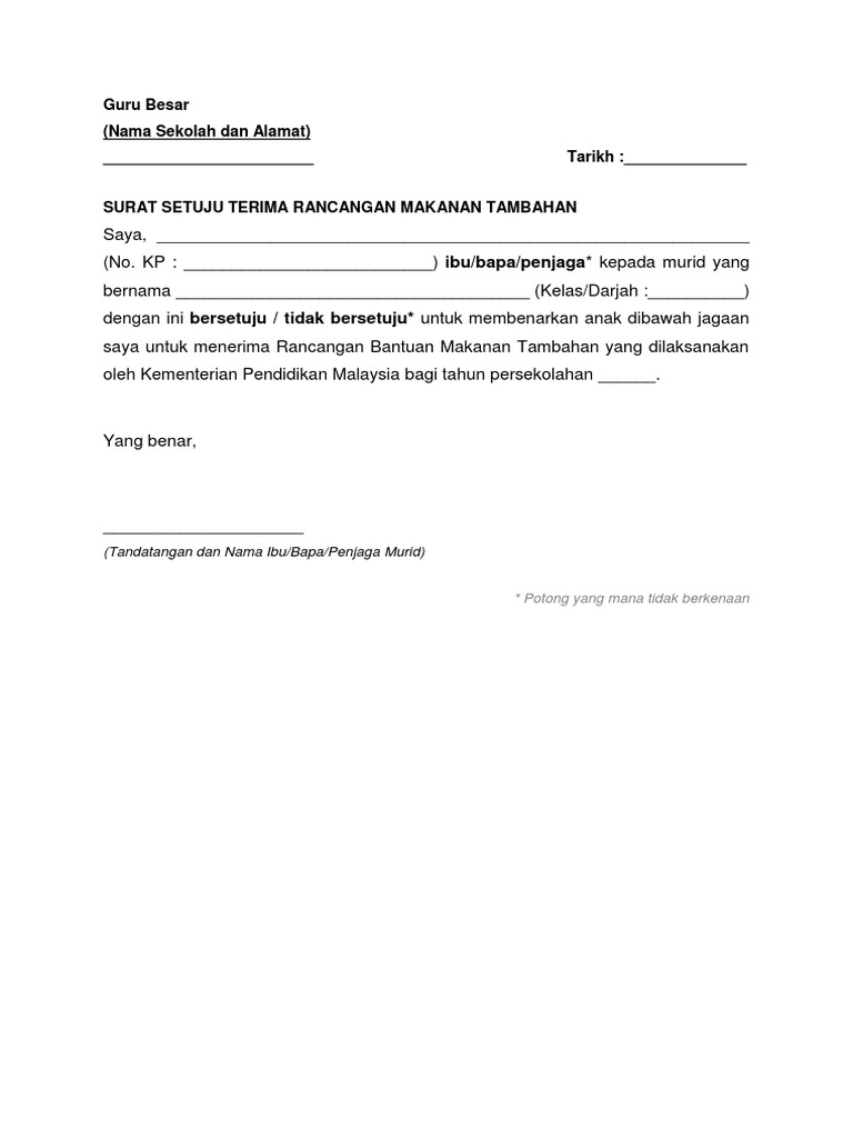 2 Surat Setuju Terima Bantuan Rancangan Makanan Tambahan 1 Malaysia Docx