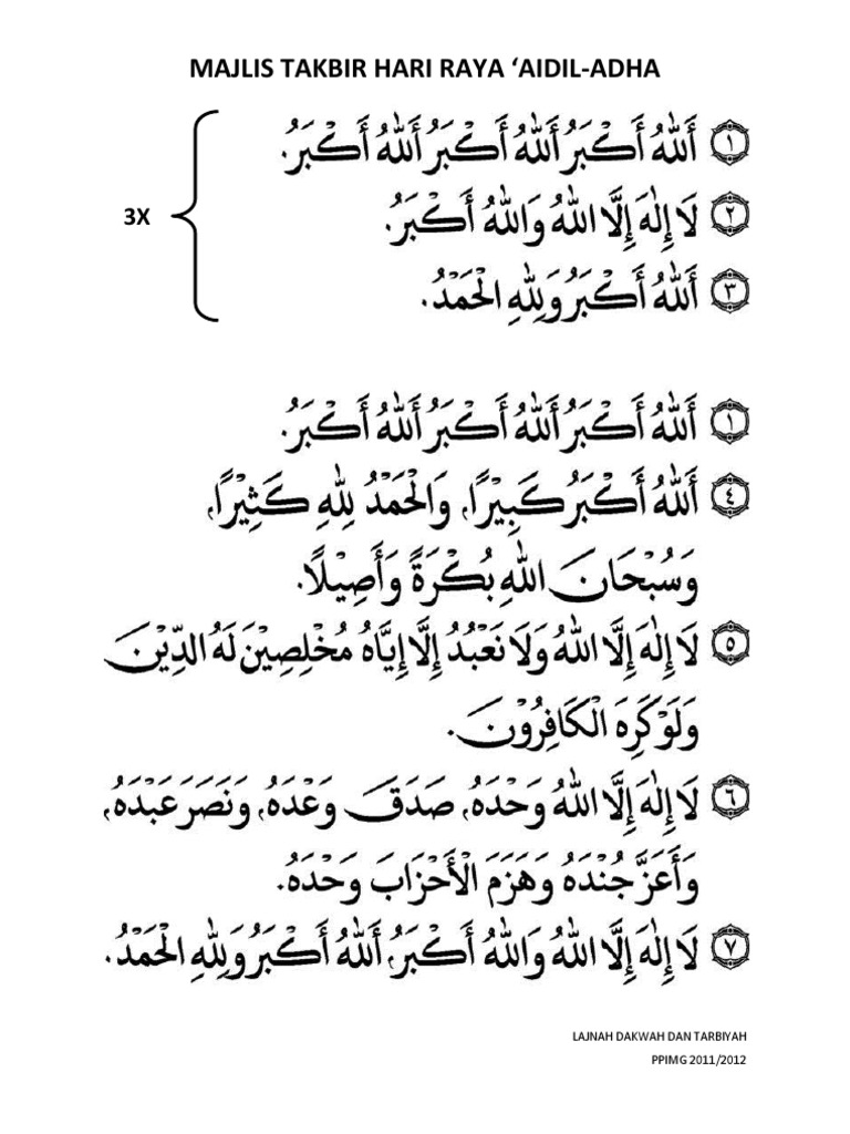 Dalam menunaikan perintah allah dan kesabaran anaknya nabi ismail a s. Hari raya aidiladha 1 hari raya ini disambut selama empat hari iaitu pada 10 11 12 dan 13 zulhijjah. Takbir hari raya aidiladha pula dilakukan bermula selepas selesai solat subuh 9 zulhijjah sehinggalah selesai solat asar 13 zulhijjah. Berikut disediakan lafaz takbir hari raya yang lengkap beserta terjemahan dan juga teks rumi bagi memudahkan semua untuk menjadi rujukan dan panduan.