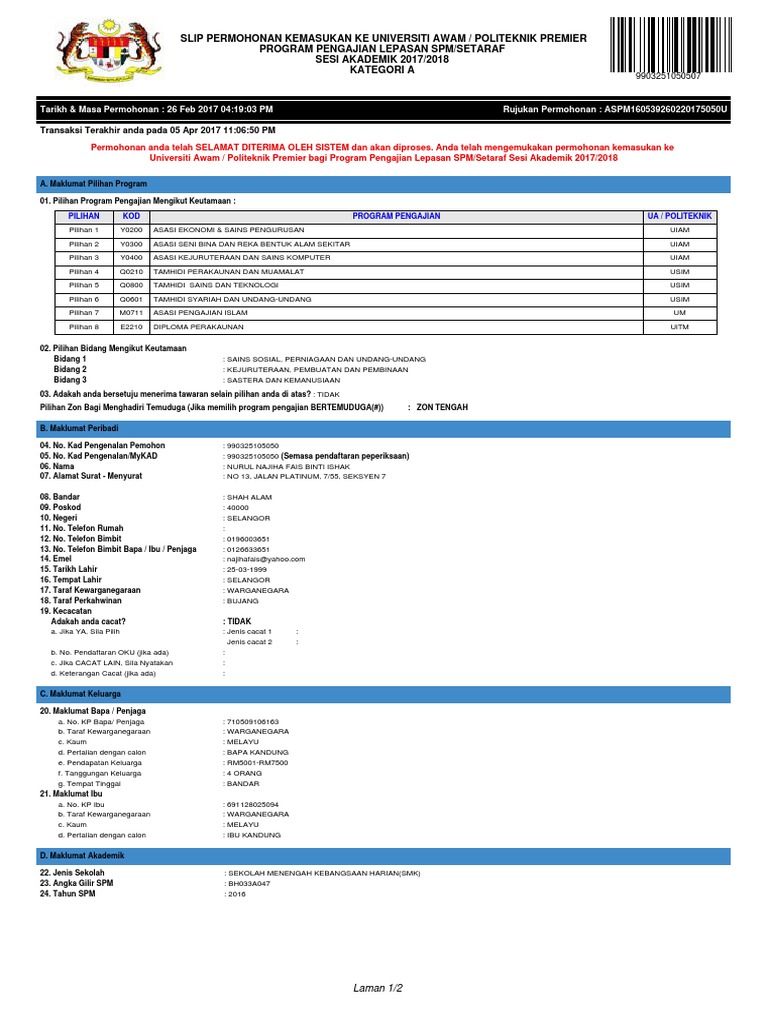 Slip Permohonan Kemasukan Ke Universiti Awam Politeknik Premier Program Pengajian Lepasan Spm Setaraf Sesi Akademik 2017 2018 Kategori A