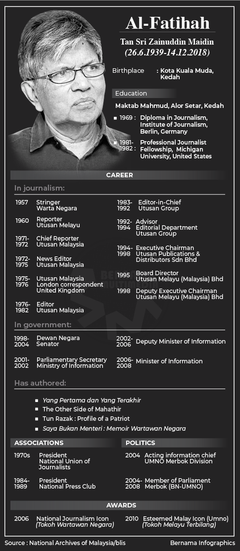 Tan sri zainuddin maidin. Tan sri zainuddin maidin who died on friday and teh tarik were just inseparable. 26 june 1939 14 december 2018 was a malaysian politician and the former information minister in the malaysian cabinet representing united malays national organisation umno in the barisan nasional bn coalition government. Menerusi ruangan pojok awang selamat dalam akhbar mingguan malaysia beliau menulis secara provokatif terhadap puak pelampau melayu dan bukan melayu. Everyone who knew the veteran journalist would have a story to tell about zam s love for the national drink.