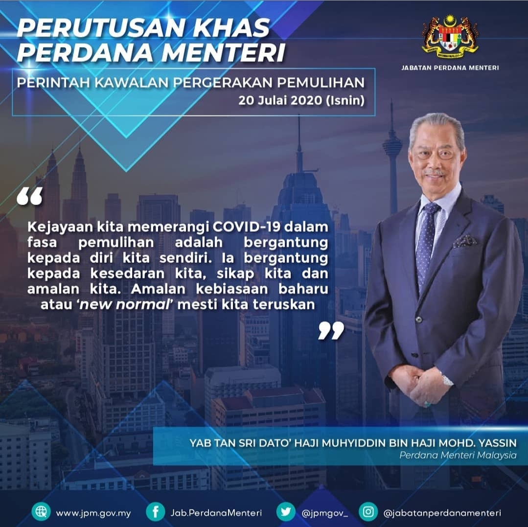 Pejabat Perdana Menteri Malaysia Perutusan Khas Yab Perdana Menteri Mengenai Perkembangan Terkini Perintah Kawalan Pergerakan Pemulihan 20 Julai 2020