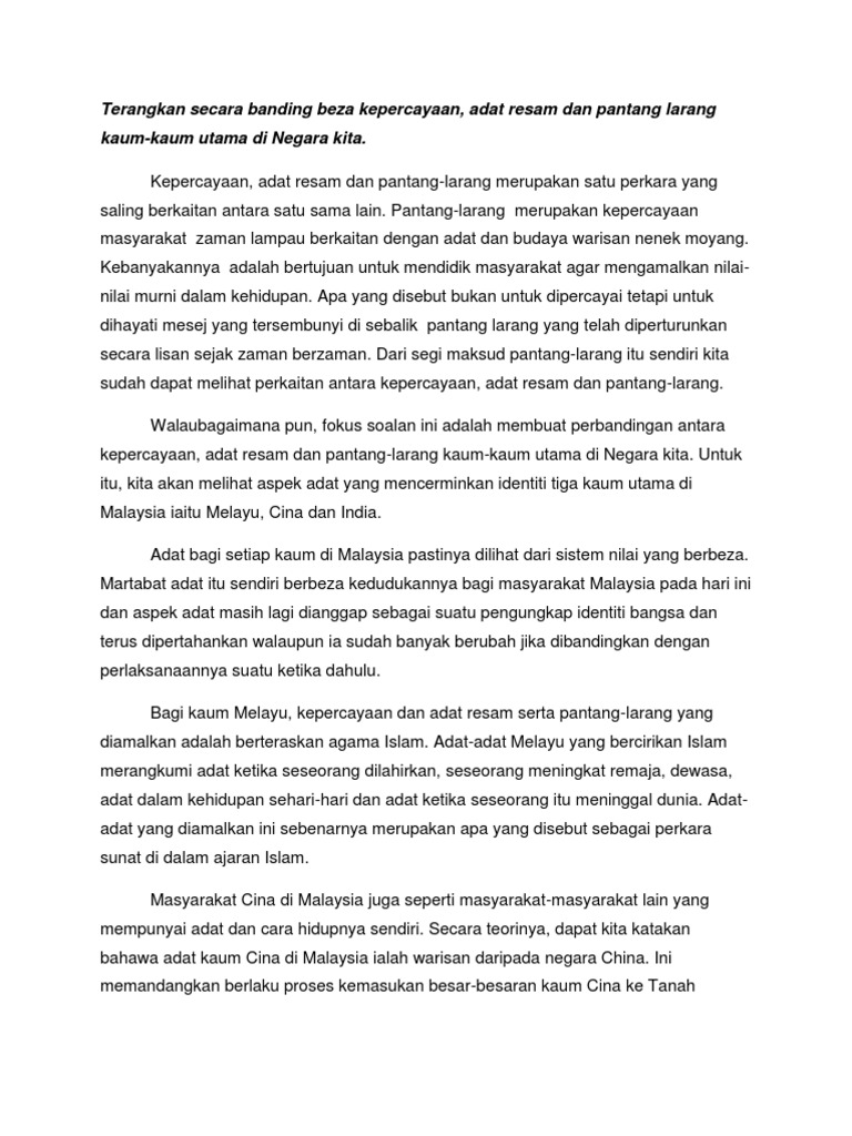 Terangkan Secara Banding Beza Kepercayaan Adat Resam Dan Pantang Larang Kaum Kaum Utama Di Negara Kita