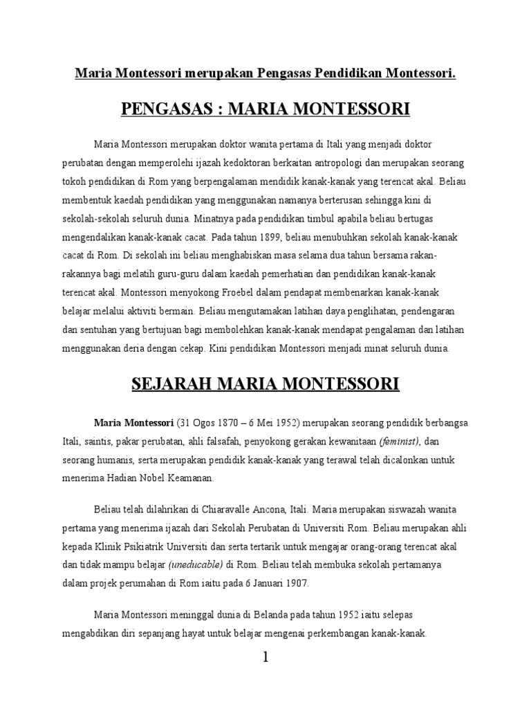 Tokoh Pendidikan Awal Kanak Kanak Maria Montessori