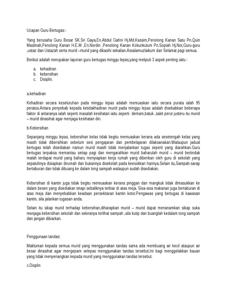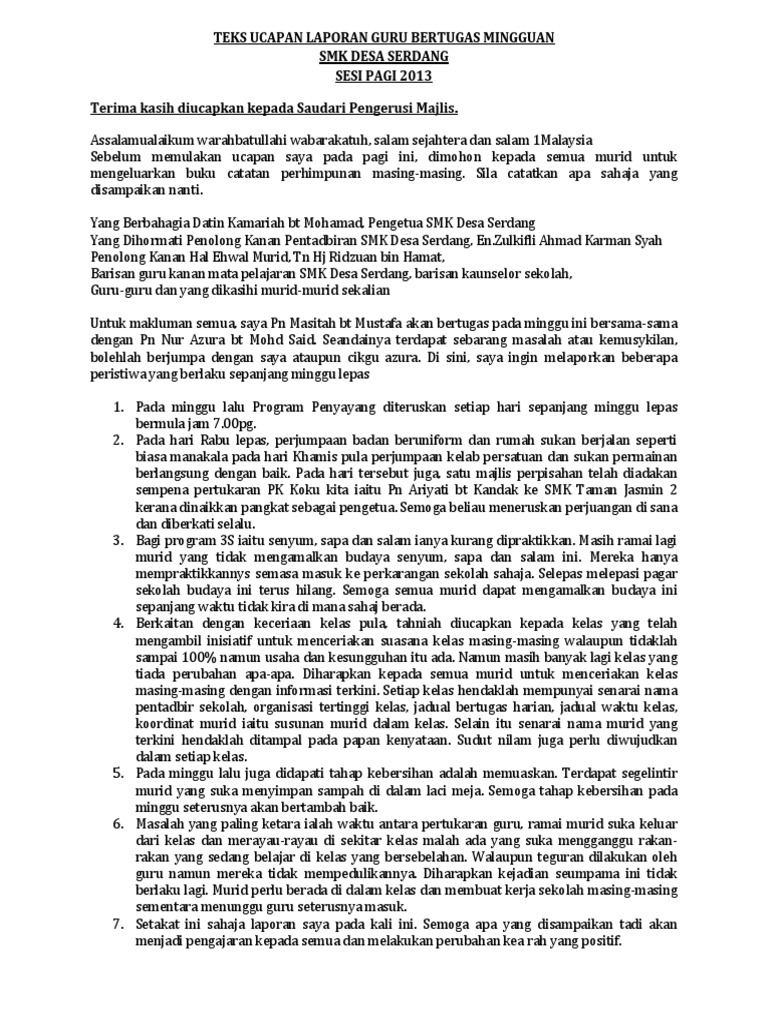 Teks Ucapan Guru Bertugas Semasa Perhimpunan Mingguan Sekolah Docx Document