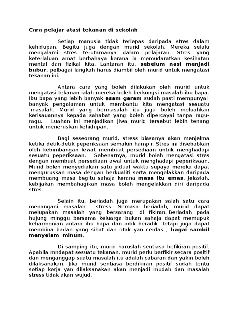 Dengan mendekatkan diri kepada tuhan remaja dapat menerima hakikat bahawa masalah yang datang itu adalah dugaan daripada tuhan untuk menguji tahap keimanan seseorang. Untuk itu beberapa cara mengatasi anak stress belajar di rumah berikut ini dapat anda coba. Harap artikel ini boleh membantu anda dalam menghilangkan masalah tekanan diri anda. Sebagai rujukan para pelajar berikut dikongsikan contoh karangan cara cara mengatasi tstress atau ekanan salah satu cara menghilangkan stress.