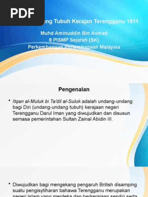 Undang undang tubuh kerajaan terengganu 1911. Undang undang ini menjadi perlembagaan bagi negeri. Pelaksanaan undang undang tubuh kerajaan terengganu tahun 1911 memperlihatkan kesungguhan sultan zainal abidin iii dalam usaha mengekalkan kedaulatan negeri terengganu. Selain itu segala modus operandi ini juga dilakukan atas dasar kesedaran dan pegangan akidah yang tinggi sultan zainal abidin terhadap implikasi jika membiarkan penjajah menguasai sistem politik di terengganu. The terengganu state legal document undang undang bagi diri kerajaan terengganu itqân al mulûk bi ta dîl al sulûk is a printed text ordered to be written by the then ruler of terengganu sultan zainal abidin the third dated 11th zulqa dah 1329 h or 2nd november 1911 c e.